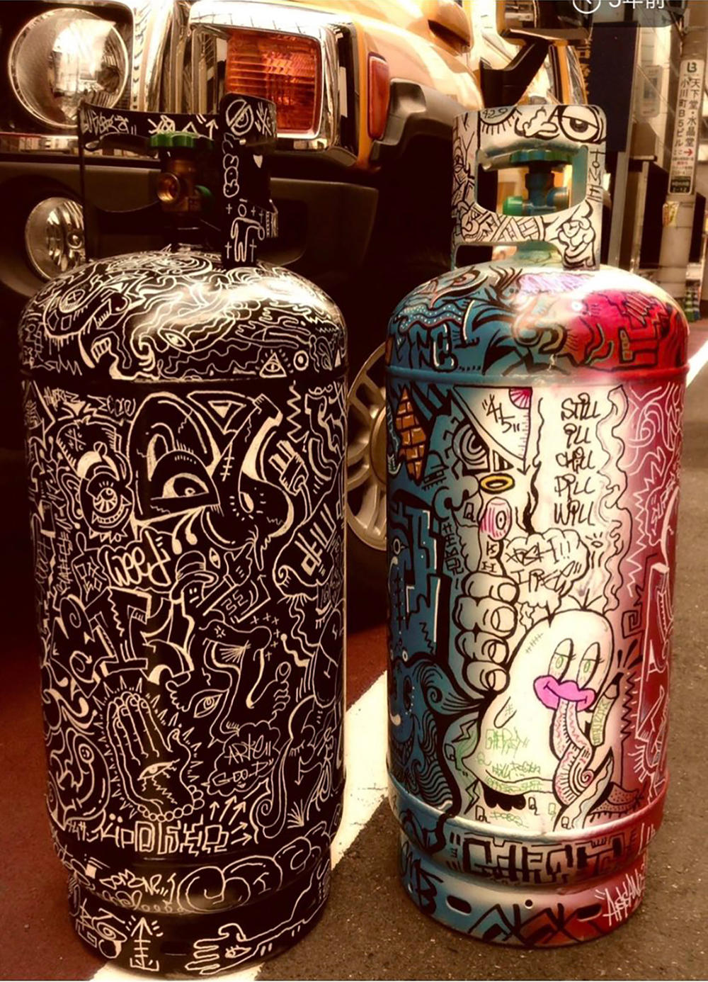 スニーカー、ガスタンクや達磨、カラーコーンなどへのペイントなど、デジタル画の企業案件、ご依頼の絵、さらには塗料が乗るモノにはなんにでも描くアナログスタイルなど、多様なスタイルで作品を生み出している。