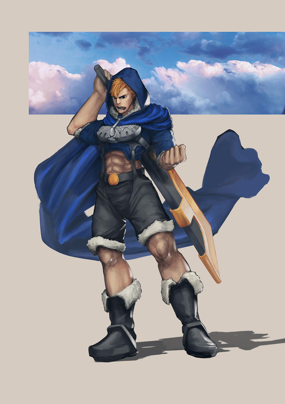 スマホのゲームアプリに出てきそうなキャラクターをイメージしたイラストです。服の陰影でその下の筋肉のつき方がわかるよう描くことを意識しました。また服や武器の質感をそれぞれ変えることで、よりリアルなデザインになったかと思います。