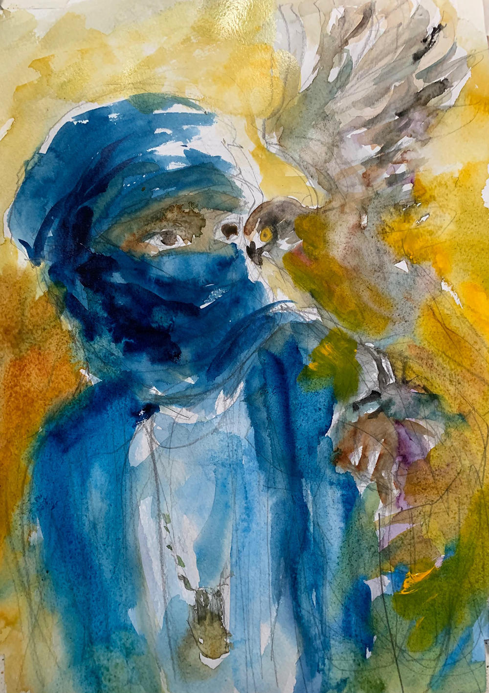 青い神秘的な衣装の砂漠の鷹匠。 金色の太陽に照らされる人と鷹の強い絆を表現した。