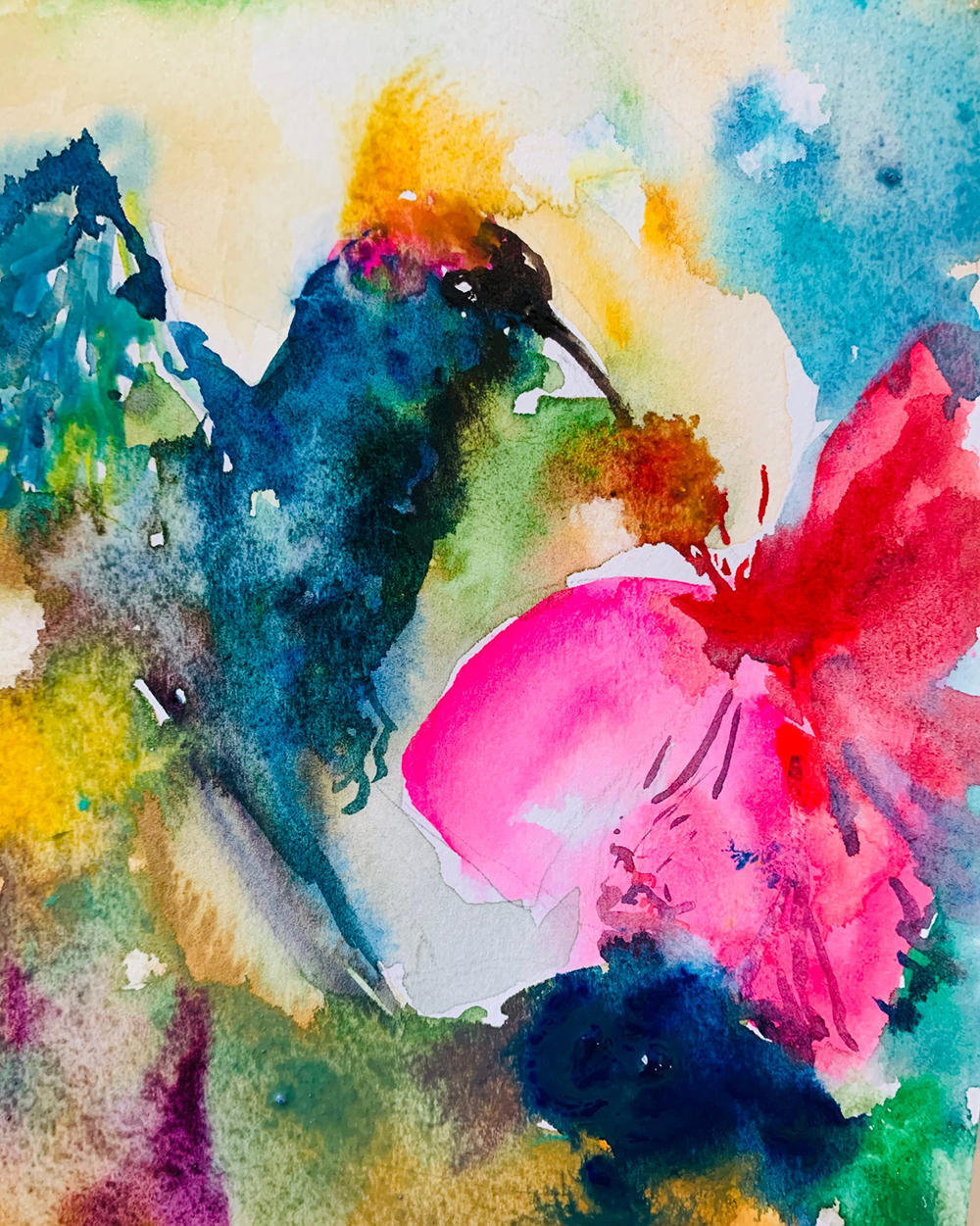 溢れる光の中で花々を飛び回るハチドリの生命感を表現した。