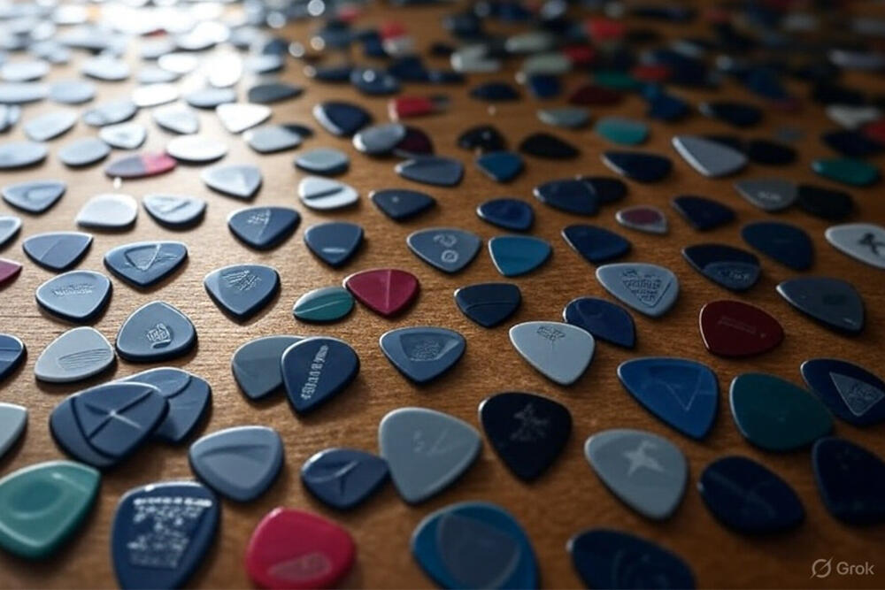 その上それぞれに複数種類の厚さがあったりする。ペラッペラの薄いものもあれば、指ではほぼ曲がらないような厚いものまでこれも多種多様。そういった要素が絡み合って、弦に当たった時の感じが違ったりして当然音にも影響があるし、硬さ、しなり具合、指へのフィット感、耐久性、まぁいろいろ違いが出るわけだな。