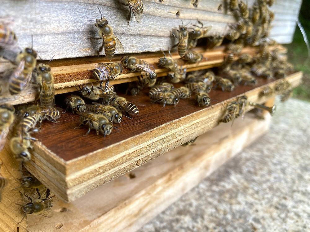 翌朝も探索バチが来ている。これまでも何度か結構な数の探索バチが来ていても入らない事の方が多いので期待はできないが、そもそも全然来ないよりは楽しい。結局一週間くらい毎日探索バチが数十匹くらい来ていたので、ワンチャンあるかもなと思っていた。ある日の夕方かなりの数のみつばちがやってきたので入るのかなと思いきや翌朝みると入っていない感じだったので流石に他にいい場所を見つけたのかなと思っていたのだけれど、2日くらいして昼頃起きて見に行ってみると入居していた。ヤッター嬉しい。入居していると日本みつばちは早速巣作りに翻弄するので巣の出入りの仕方を見ればなんとなくわかるのだ。