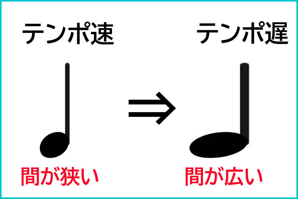 ここで言う音の長さ=“間”になるワケですが、画像にあるように、テンポが速ければ速いほど、1つの音符の間(長さ)は短いです。